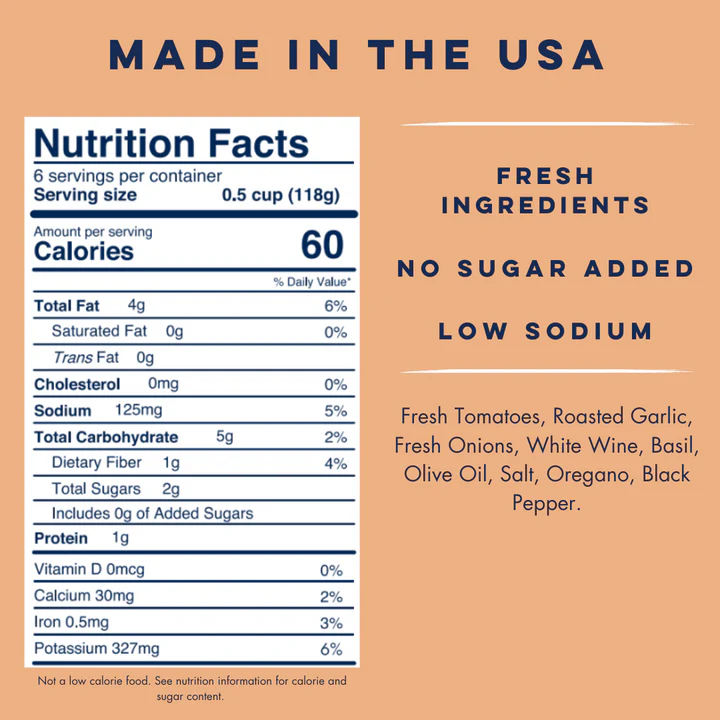 Ingredients: Fresh Tomatoes, Roasted Garlic, Fresh Onions, White Wine, Olive Oil, Salt, Oregano, Black Pepper