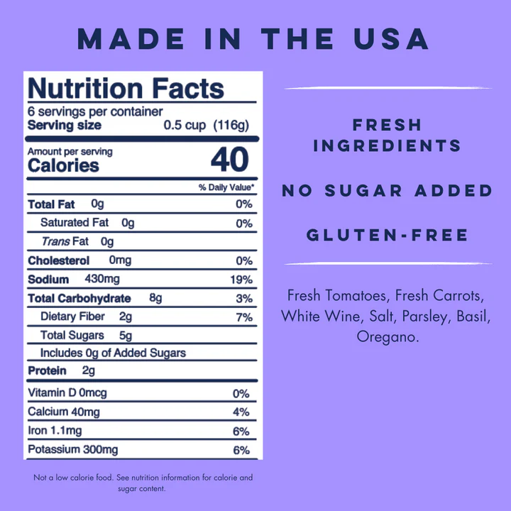 Ingredients: Fresh Tomatoes, Fresh Carrots, White Wine, Salt, Parsley, Basil, Oregano