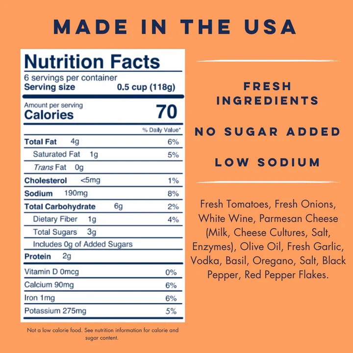 Ingredients: Fresh Tomatoes, Fresh Onions, White Wine, Parmesan Cheese (Milk, Cheese Cultures, Salt, Enzymes), Olive Oil, Fresh Garlic, Vodka, Basil, Oregano, Salt, Black Pepper, Red Pepper Flakes