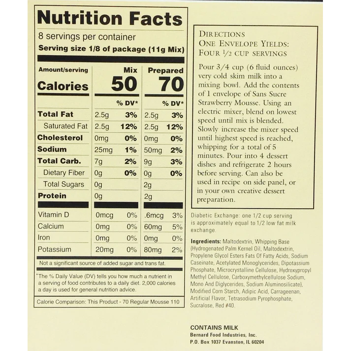 Sans Sucre Mousse Mix is smooth, rich, creamy, sugar free, and is sweetened with sucralose. Sans Sucre Mousse is also low fat and low cholesterol. Each gourmet flavor is produced with the finest domestic and imported ingredients, quality that is apparent in every delicious spoonful. No cooking required; simply add skim milk, chill, and serve. Sans Sucre Mousse Mix can be used for pies, tarts, and parfaits.