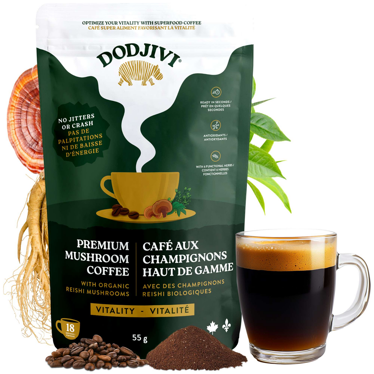 Dodjivi’s Reishi Ganoderma Mushroom Coffee is formulated to enhance your path to wellness. It’s everything you want from your favorite brew — with none of the negative effects. We’ve blended functional Reishi with Colombian-grown 100% Arabica micro-ground coffee and with good-for-you plant-based ingredients to have you feel at your best with every sip!