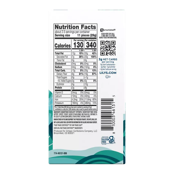 Ingredients: UNSWEETENED CHOCOLATE, ERYTHRITOL, CHICORY ROOT FIBER, COCOA BUTTER, COFFEE, COCOA, BLEND OF PALM KERNEL AND PALM OLS, CONTAINS 2% OR LESS OF: LECITHIN (SUNFLOWER), STEVIA EXTRACT, NATURAL FLAVOR