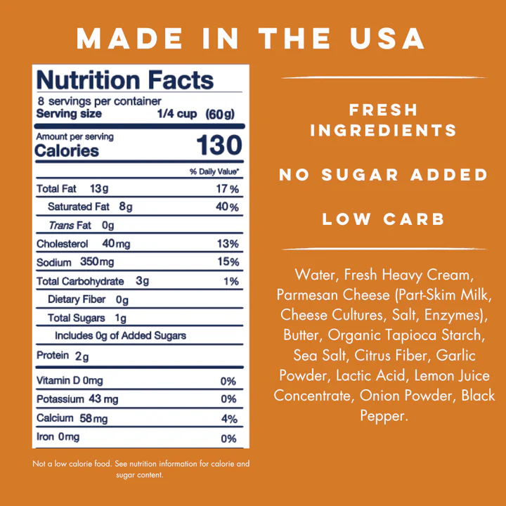 Ingredients: Water, Fresh Heavy Cream, Parmesan Cheese (Milk, Cheese Cultures, Salt, Enzymes), Butter, Organic Tapioca Starch, Sea Salt, Citrus Fiber, Garlic Powder, Lactic Acid, Lemon Juice Concentrate, Onion Powder, Black Pepper