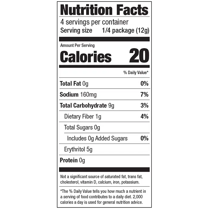 Valeurs nutritionnelles : Par 1/4 sachet (12 g) Calories : 20, Lipides : 0 g, Cholestorol : 0 mg, Sodium : 280 mg, Glucides : 9 g, Sucre : 0 g, Protéines : 0 g