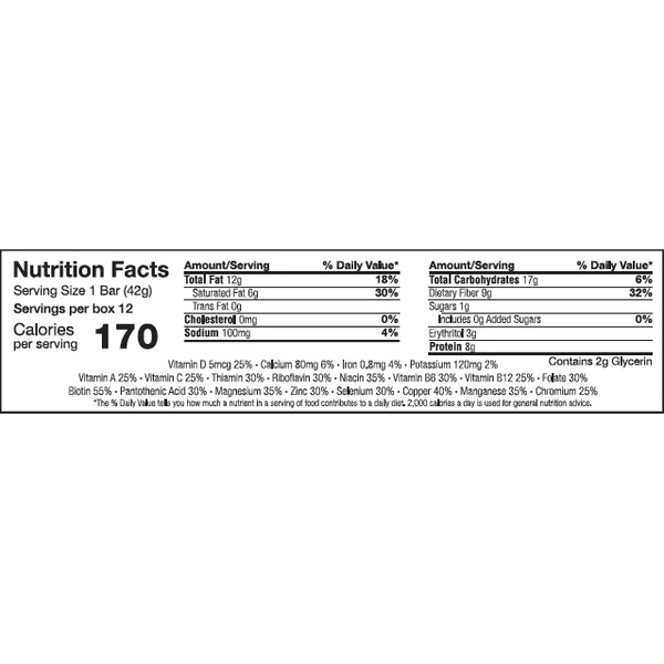 Valeurs nutritionnelles : Portion : 1 barre (60 g), Calories 250, Lipides 18 g, Gras saturés 10 g, Gras trans 0, Cholestérol 7 mg, Sodium 165 mg, Glucides 25 g, Fibres 17 g , Sucres 1 g, Érythritol 5 g, Protéines 11 g.