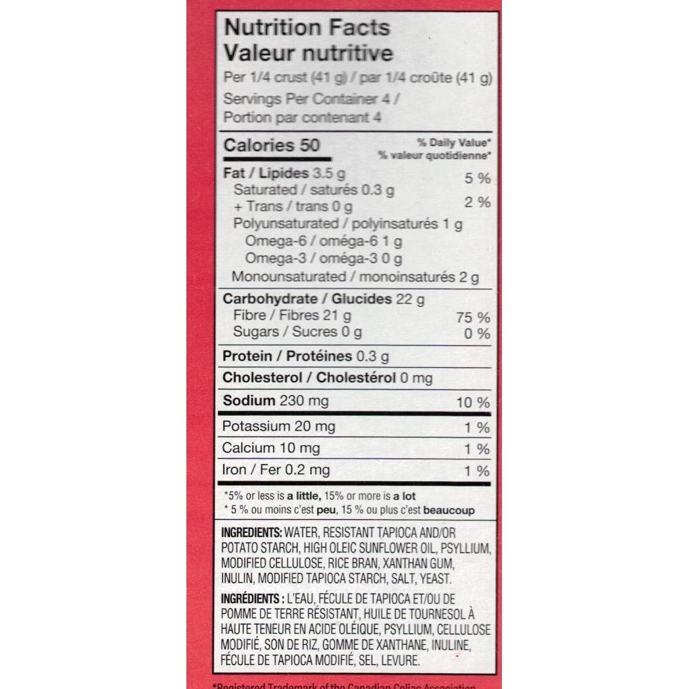 INGRÉDIENTS : Eau, fécule de tapioca et/ou de pomme de terre résistante, huile de tournesol à haute teneur en acide oléique, psyllium, cellulose modifiée, pistolet au xanthane, son de riz, inuline, levure, amidon de tapioca modifié, sel.
