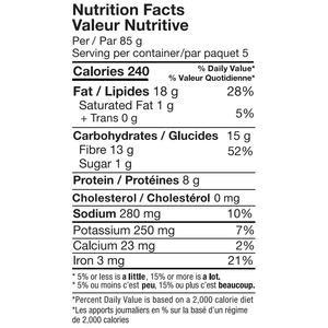 Nutrition Facts: 1 bun 85g: Calories 240, Fat 18g, Saturated Fat 1g, Trans Fat 0 g, Cholesterol 0mg, Sodium 280mg, Carbohydrate 15g, Fiber 13g, Sugar 1g, Protein 8g