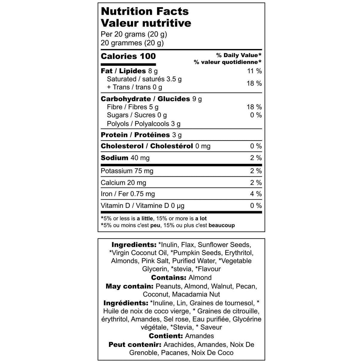 Ingrédients: *Inuline, Lin, Graines de tournesol, Huile de noix de coco vierge, * Graines de citrouille, érythritol, Amandes, Sel rose, Eau purifiée, Glycérine végétale, *Stevia, *Saveur