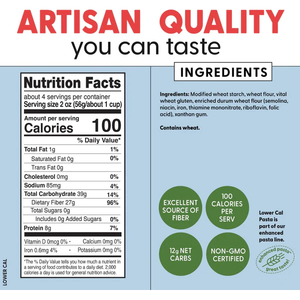 A lower calorie, low carb pasta that tastes like pasta! Pastabilities Lower Cal Pasta is half the calories of traditional pasta (100 calories vs. 200 calories per serving) and only 12g net carbs! Whether you are trying to cut calories or cut carbs…this pasta delivers! Plus it’s an excellent source of fiber!