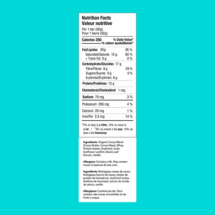 INGREDIENTS:Â Organic Cocoa Blend (Cocoa Butter, Cocoa Mass), Whey Protein Isolate, Erythritol, Insulin, Sunflower, Lecithin, Stevia Leaf Extract, Vanilla